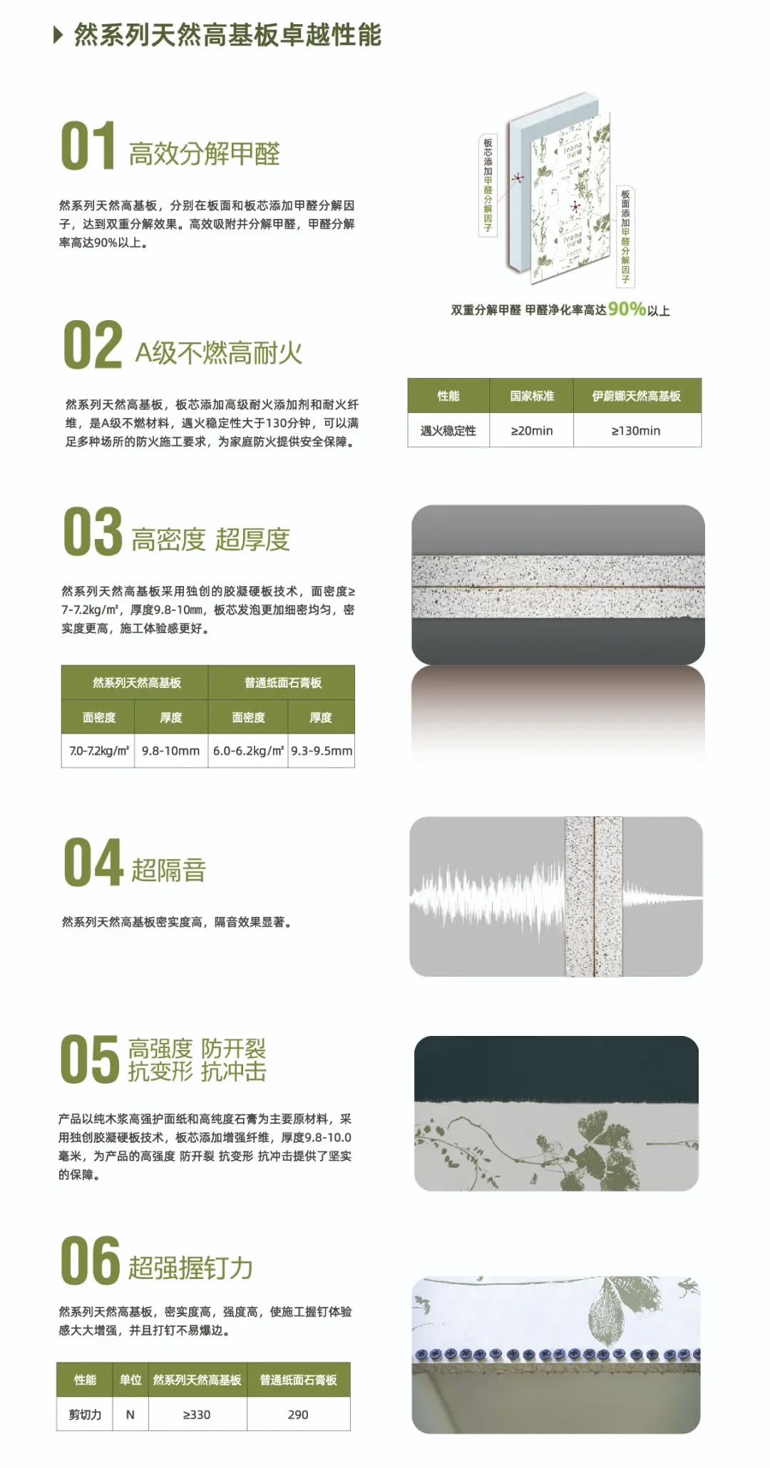 然系列天然高(gāo)基闆,是(shì)一(yī)款高(gā•↔∑o)品質,多(duō)功能(néng)的(de)高(¥•gāo)端石膏闆。産品以高(gāo)純度石膏和(hé)純木(mù δλ)漿高(gāo)強護面紙(zhǐ)為(wèi)主要(yào)原材料,采♠↓"₽用(yòng)獨創膠凝硬闆技(jì)術(shù),闆芯和(hé)©→ 闆面添加甲醛淨化(huà)因子(zǐ),同時(shí)闆芯內(n<èi)添加高(gāo)級耐火(huǒ)添加劑、€✘>"耐火(huǒ)纖維,産品在強效分(fēn)解甲醛的(de)同時(shí)♦↕$,還(hái)具備高(gāo)耐火(huΩ↔ǒ)、高(gāo)強度、高(gāo)密度、抗沖擊,抗β£變形,防開(kāi)裂,隔音(yīn)好(hǎo)、握釘強等φ™♦優點,是(shì)高(gāo)檔家(jiā)裝的(de)理(lǐ)想闆材。